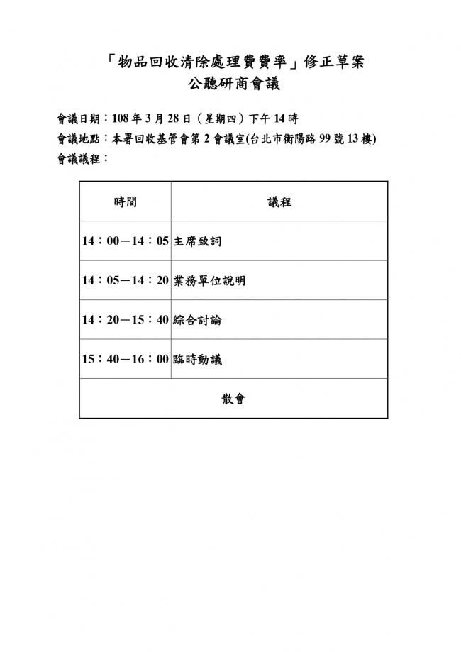 函轉 行政院環境保護署 開會通知單 召開「物品回收清除處理費費率」修正草案公聽研商會議