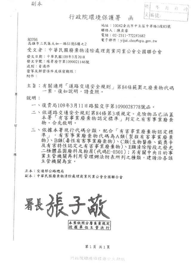 函轉 中華民國廢棄物清除處理商業同業公會全國聯合會 主旨:函轉交通部公路總局函詢行政院環境保護署有關適用「道路交通安全規則」第84條範圍之廢棄物代碼一案,詳如附件,請 查照。