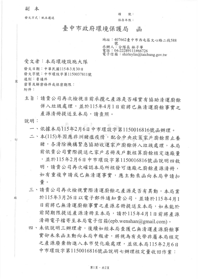 關於轉知臺中市政府環境保護局 主旨:請貴公司再次檢視目前承攬之產源是否確實有協助清運廚餘併入垃圾處理,並於115年4月1日前將已無清運廚餘事實之產源清冊提送至本局,請查照。