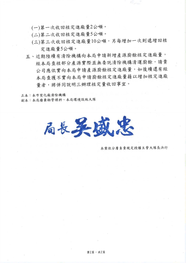 轉知臺中市政府環境保護局 主旨:請貴公司再次檢視目前承攬之產源是否確實有協助清運廚餘併入垃圾處理,並於115年4月1日前將已無清運廚餘事實之產源清冊提送至本局,請查照。
