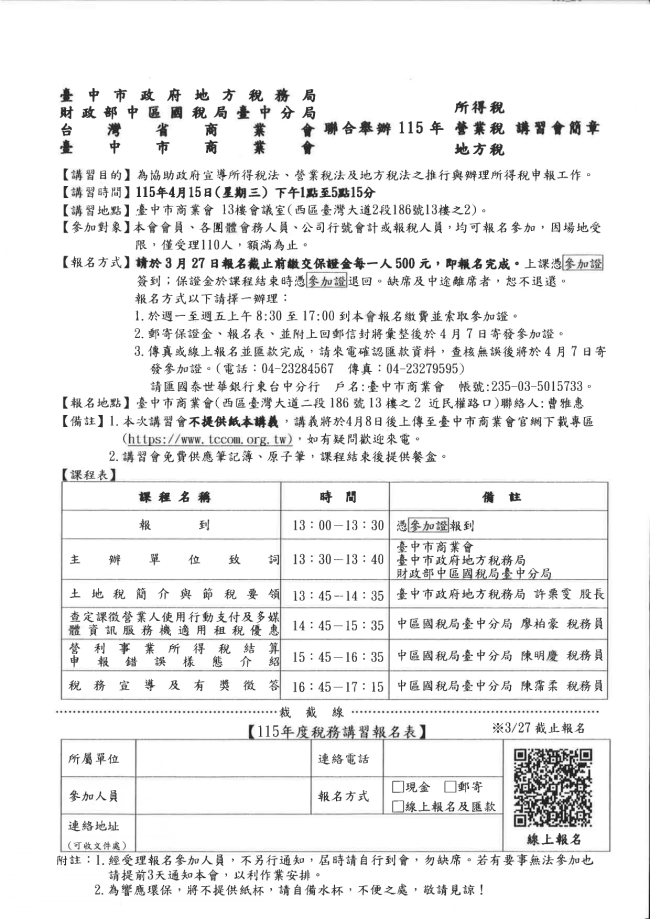 函轉臺中市商業會 主旨:檢附本會與臺中市政府地方稅務局、財政部中區國稅局臺中分局、臺灣省商業會聯合舉辦「115年所得稅、營業稅、地方稅講習會」簡章及報名表,如附件,敬請 貴會轉知所屬會員踴躍報名參加,請查照。