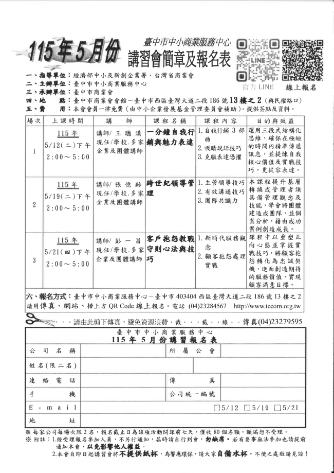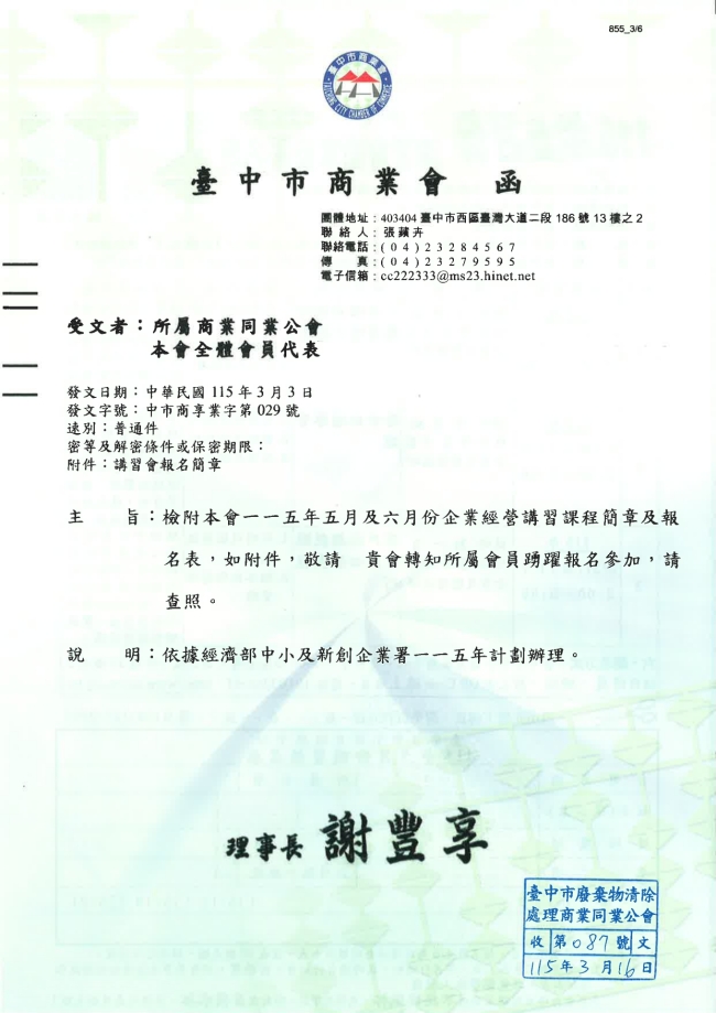 關於函轉臺中市商業會 主旨:檢附本會一一五年五月及六月份企業經營講習課程簡章及報名表,如附件,敬請 貴會轉知所屬會員踴躍報名參加,請查照。