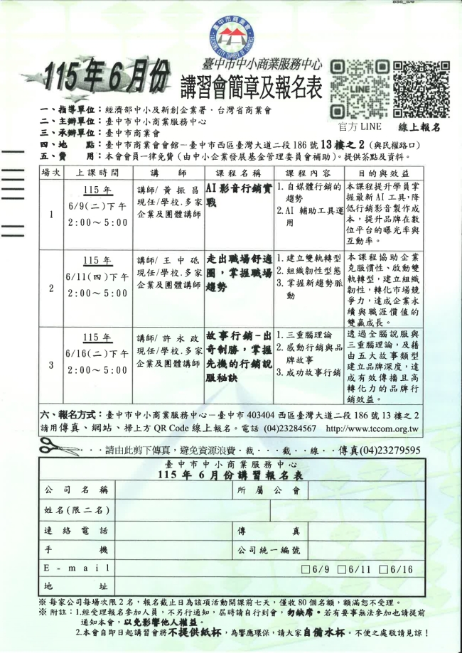 函轉臺中市商業會 主旨:檢附本會一一五年五月及六月份企業經營講習課程簡章及報名表,如附件,敬請 貴會轉知所屬會員踴躍報名參加,請查照。