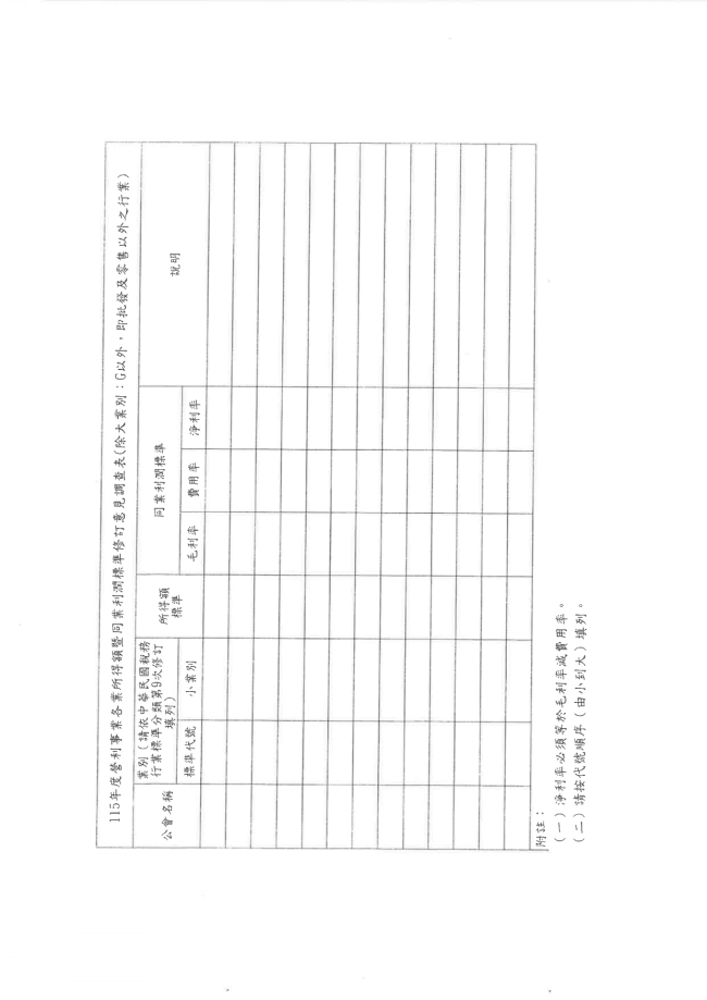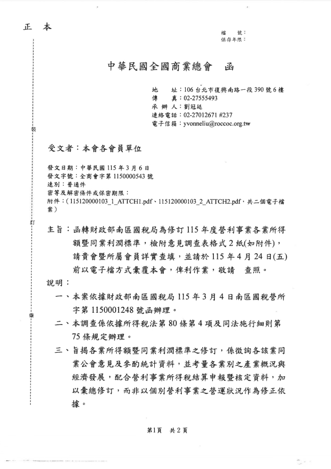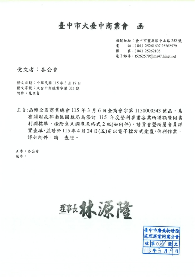 關於函轉臺中市大臺中商業會 主旨:函轉全國商業總會115年3月6日全商會字第1150000543號函,系有關財政部南區國稅局為修訂115年度營利事業各業所得額曁同業利潤標準,檢附意見調查表格式2紙(如附件),請貴會曁所屬會員詳實查填,並請於115年4月24日(五)前以電子檔方式彙覆,俾利作業,詳如附件,請查照。