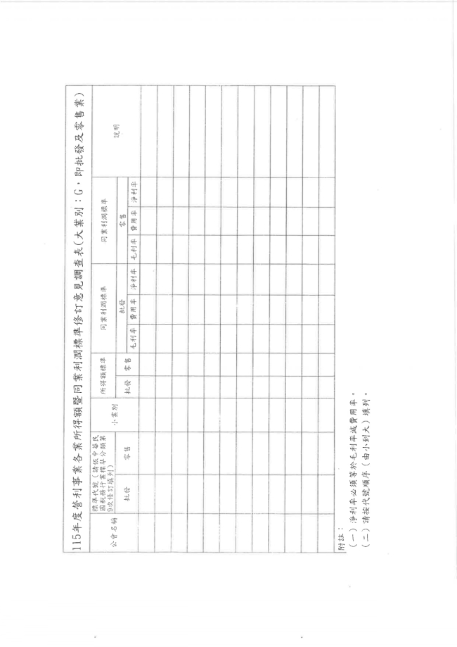 函轉臺中市大臺中商業會 主旨:函轉全國商業總會115年3月6日全商會字第1150000543號函,系有關財政部南區國稅局為修訂115年度營利事業各業所得額曁同業利潤標準,檢附意見調查表格式2紙(如附件),請貴會曁所屬會員詳實查填,並請於115年4月24日(五)前以電子檔方式彙覆,俾利作業,詳如附件,請查照。