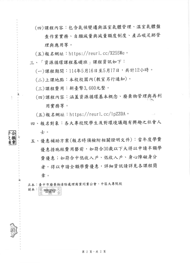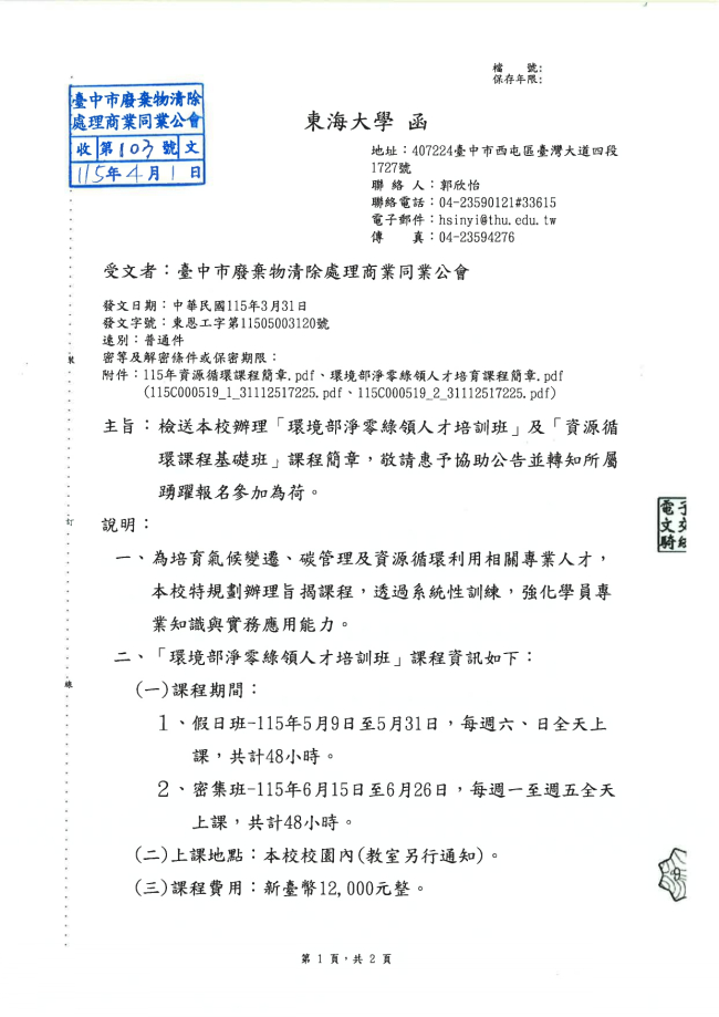 關於函轉東海大學 主旨:檢送本校辦理「環境部淨零綠領人才培訓班」及「資源循環課程基礎班」課程簡章,敬請惠予協助公告並轉知所屬踴躍報名參加為荷。