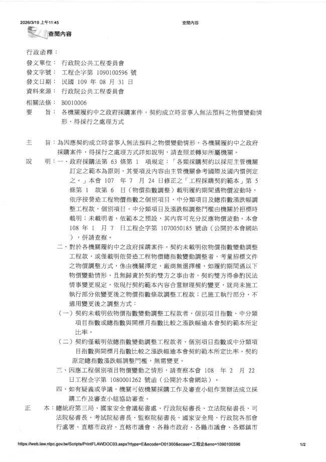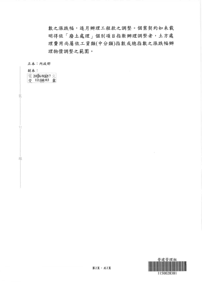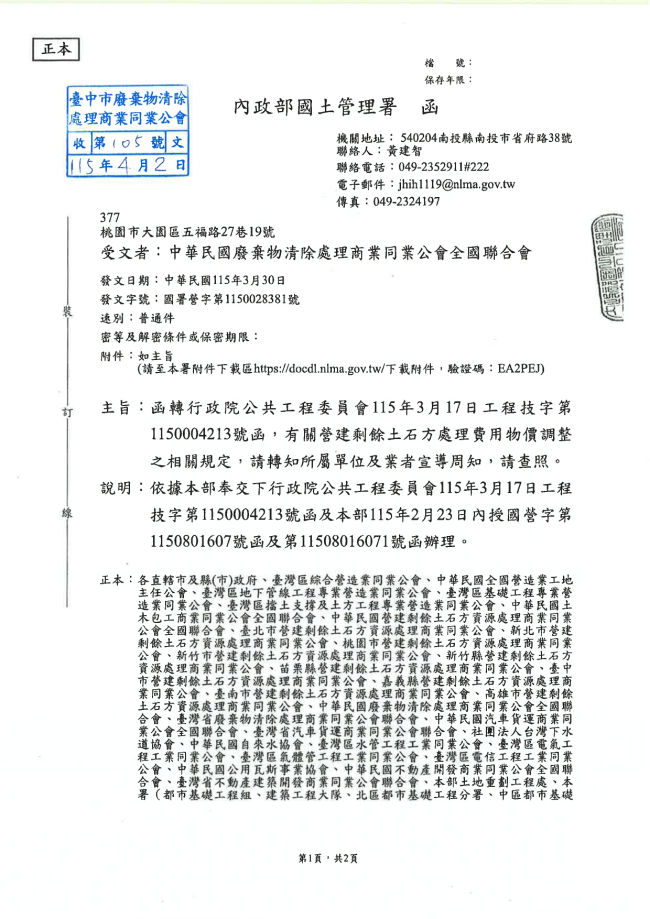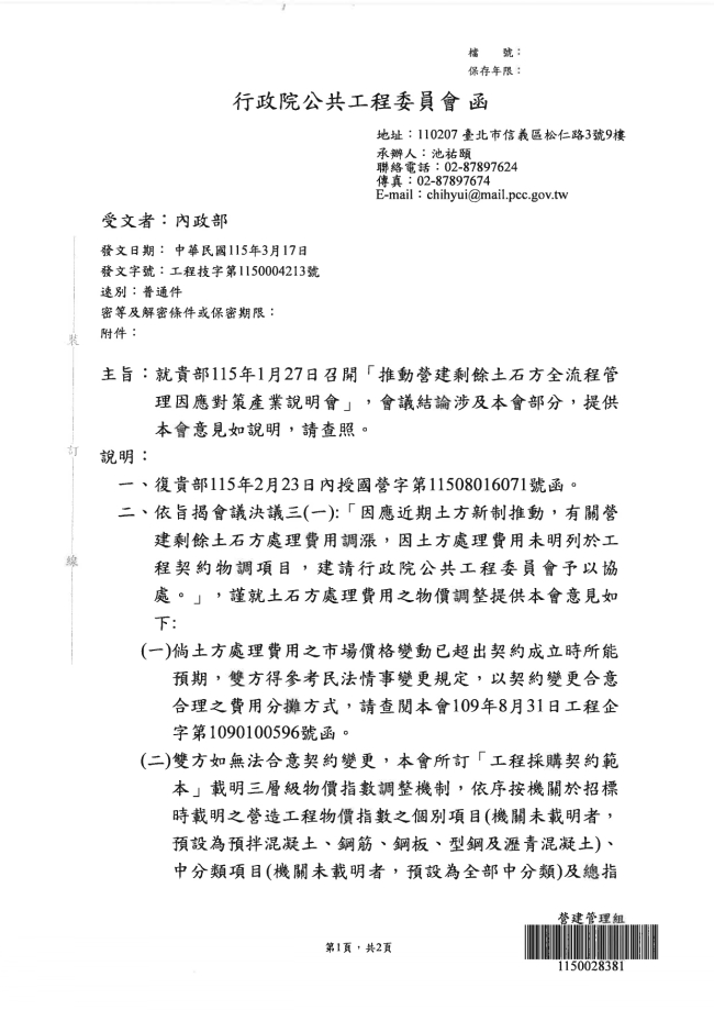 關於函轉中華民國廢棄物清除處理商業同業公會全國聯合會 主旨:函轉行政院公共工程委員會115年3月17日工程技字第1150004213號函,有關營建剩餘土石方處理費用物價調整之相關規定,請轉知所屬單位及業者宣導周知,請查照。
