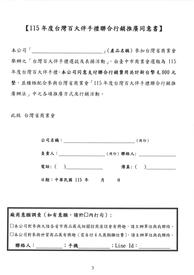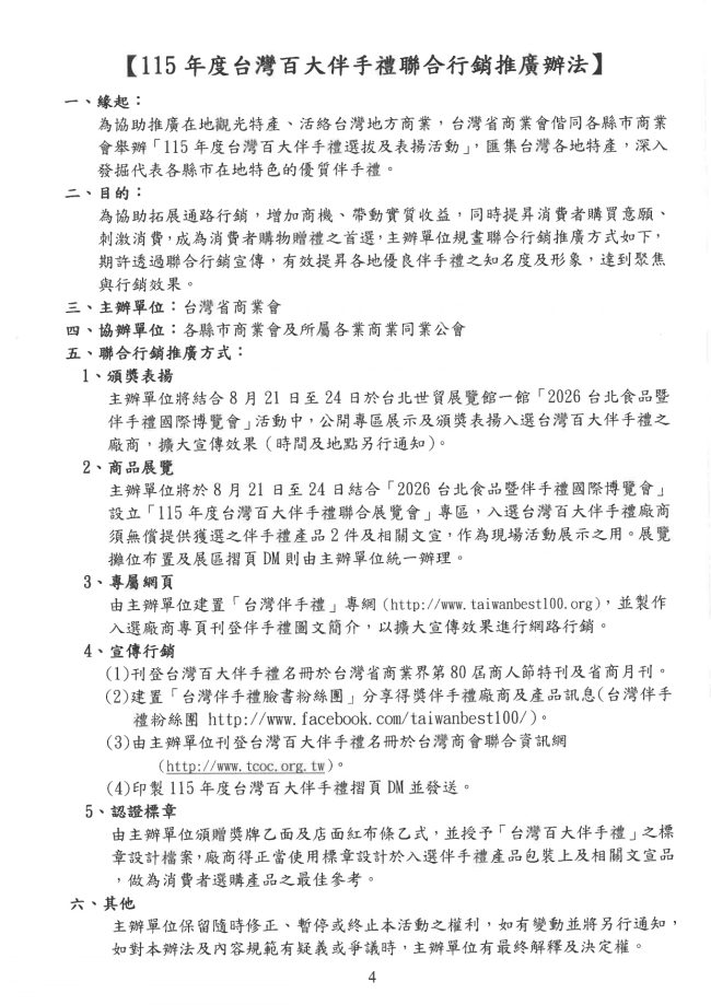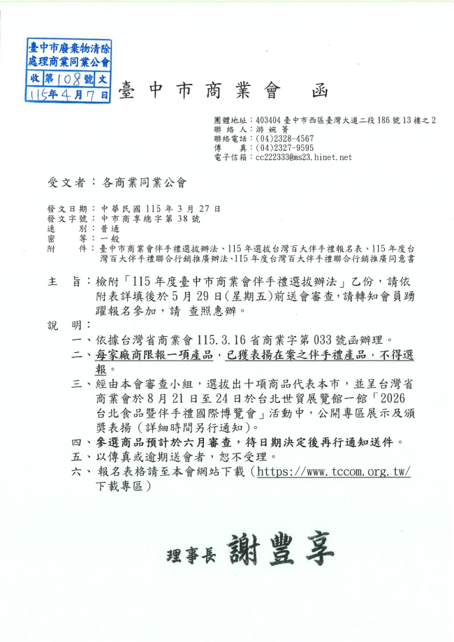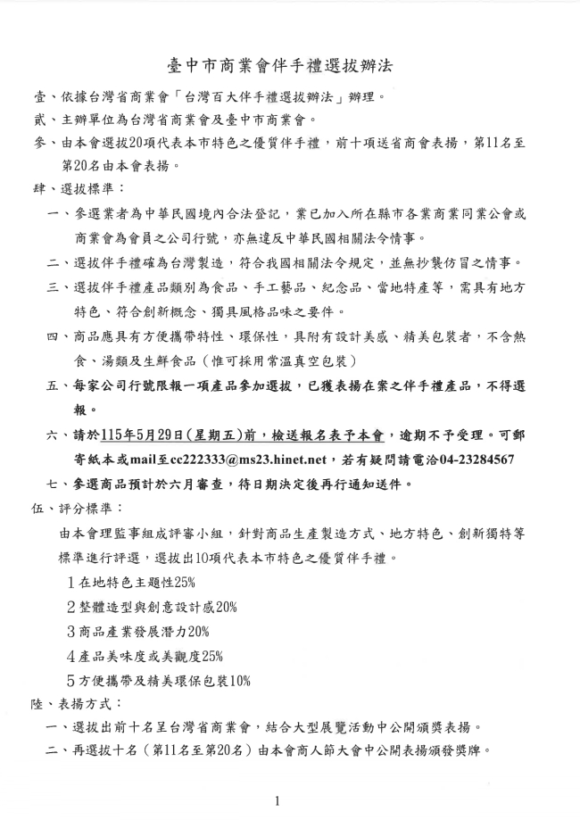 函轉臺中市商業會 主旨:檢附「115年度臺中市商業會伴手禮選拔辦法」乙份,請依附表詳填後於5月29日(星期五)前送會審查,請轉知會員踴躍報名參加,請 查照惠辦。