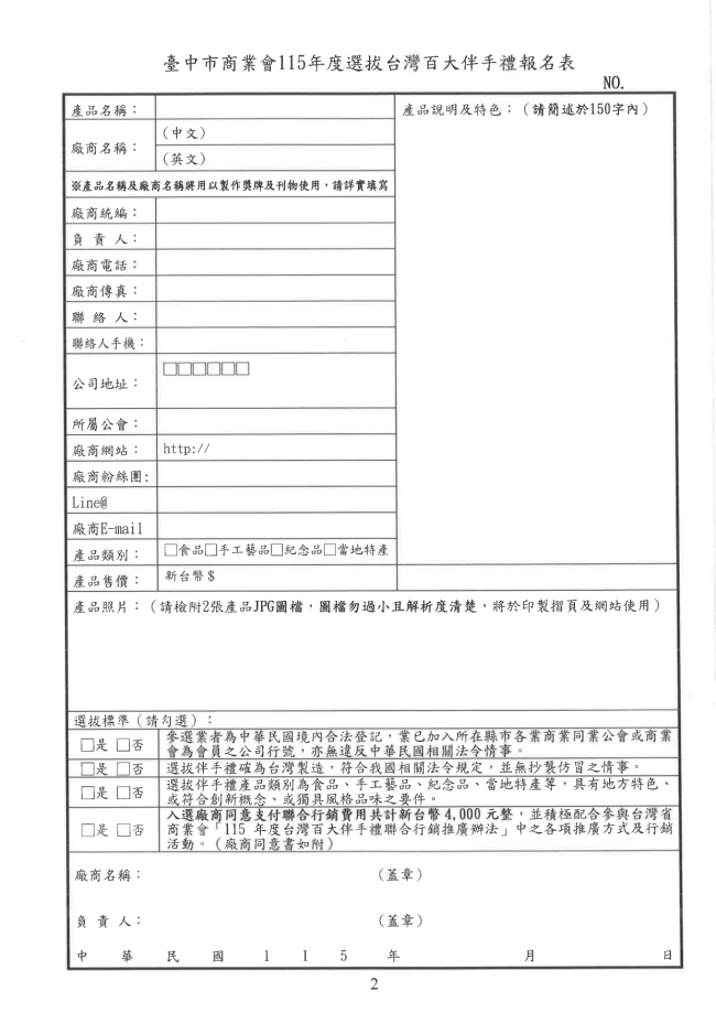 關於函轉臺中市商業會 主旨:檢附「115年度臺中市商業會伴手禮選拔辦法」乙份,請依附表詳填後於5月29日(星期五)前送會審查,請轉知會員踴躍報名參加,請 查照惠辦。