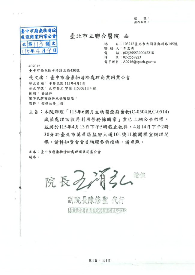 關於函轉臺北市立聯合醫院 主旨:本院辦理「115年6個月生物醫療廢棄物(C-0504及C-0514)滅菌處理回收再利用勞務採購案」業已上網公告招標,並將於115年4月13日下午5時截止收件,4月14日下午2時30分於臺北市萬華區艋舺大道101號11樓開標室辦理開標,請轉知貴會會員踴躍參與投標,請查照。