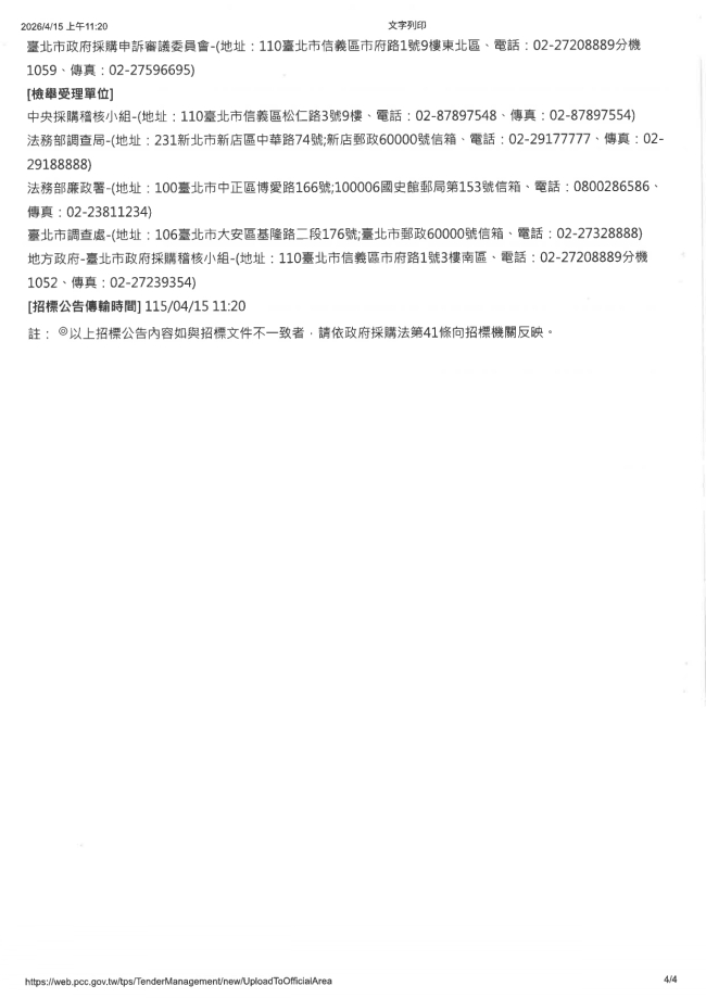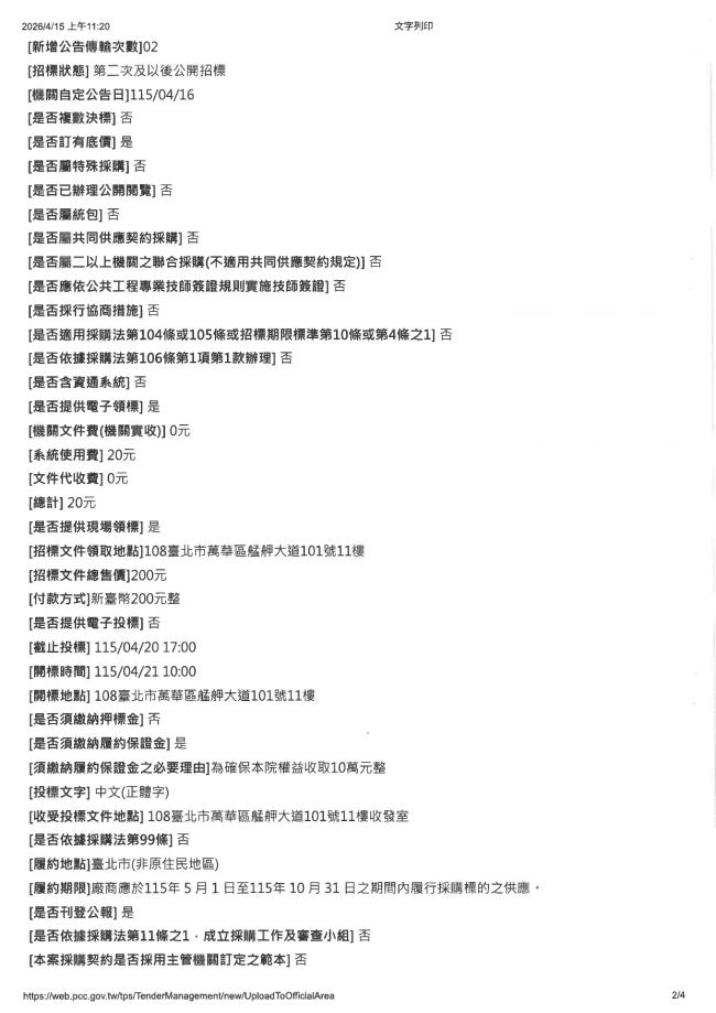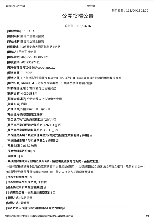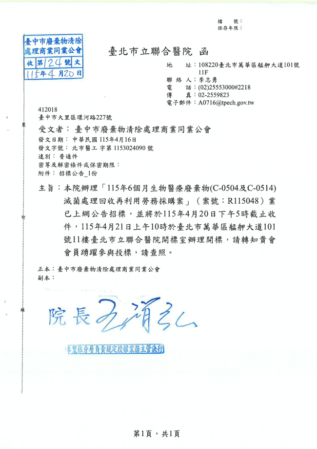 關於函轉臺北市立聯合醫院 主旨:本院辦理「115年6個月生物醫療廢棄物(C-0504及C-0514)滅菌處理回收再利用勞務採購案」(案號:R115048)業已上網公告招標,並將於115年4月20日下午5時截止收件,115年4月21日上午10時於臺北市萬華區艋舺大道101號11樓臺北市立聯合醫院開標室辦理開標,請轉知貴會會員踴躍參與投標,請查照。