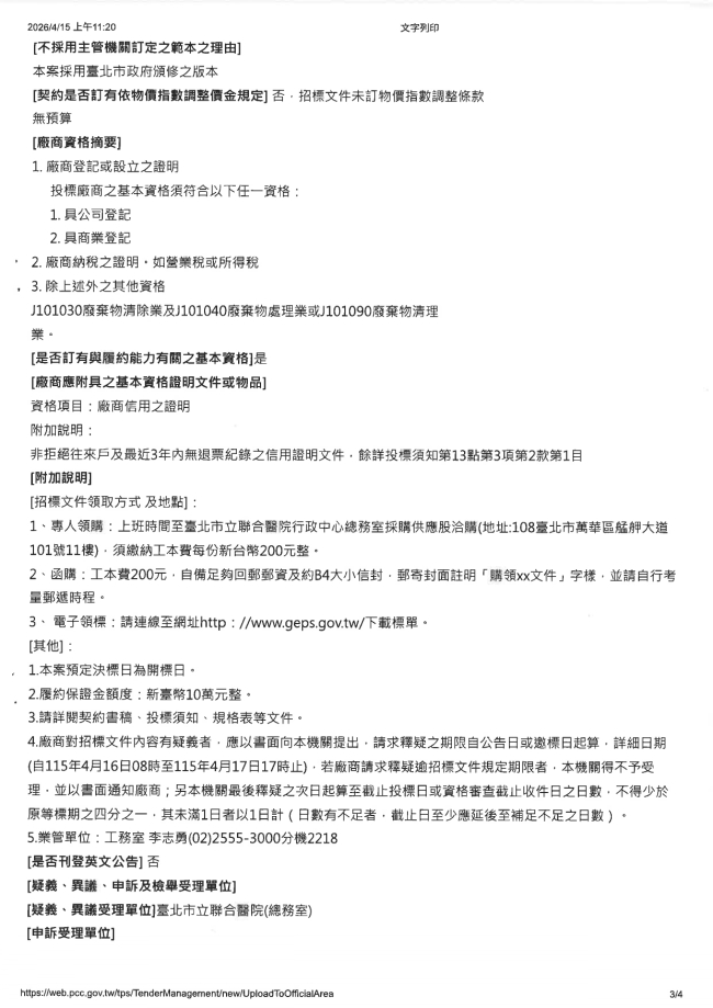 函轉臺北市立聯合醫院 主旨:本院辦理「115年6個月生物醫療廢棄物(C-0504及C-0514)滅菌處理回收再利用勞務採購案」業已上網公告招標,並將於115年4月13日下午5時截止收件,4月14日下午2時30分於臺北市萬華區艋舺大道101號11樓開標室辦理開標,請轉知貴會會員踴躍參與投標,請查照。