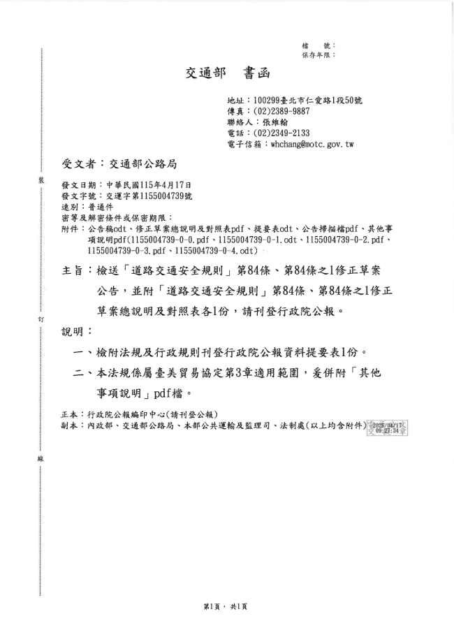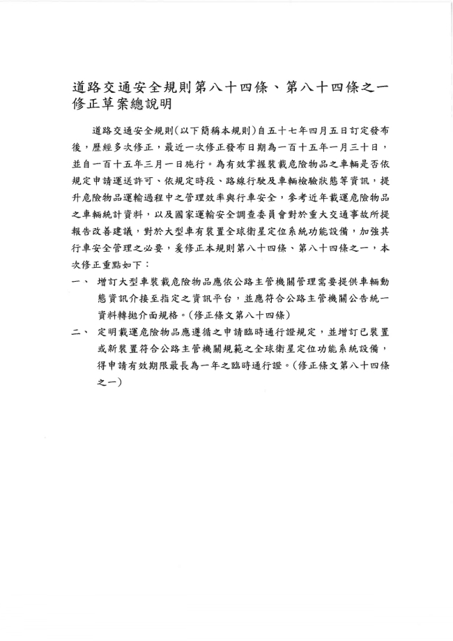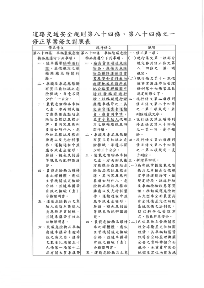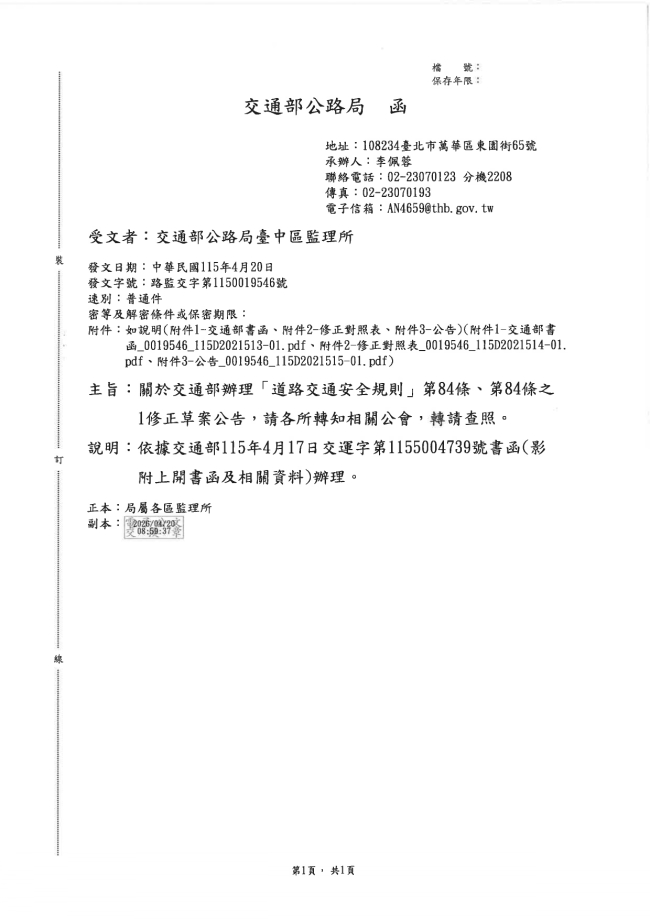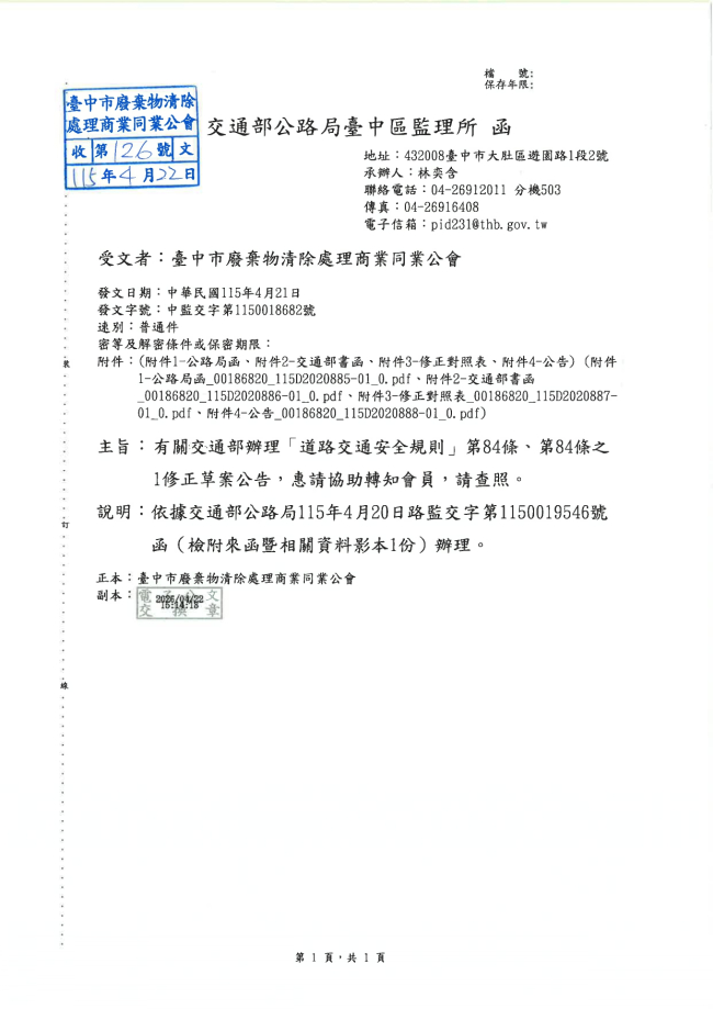 關於函轉交通部公路局臺中區監理所 主旨:有關交通部辦理「道路交通安全規則」第84條、第84條之1修正草案公告,惠請協助轉知會員,請查照。
