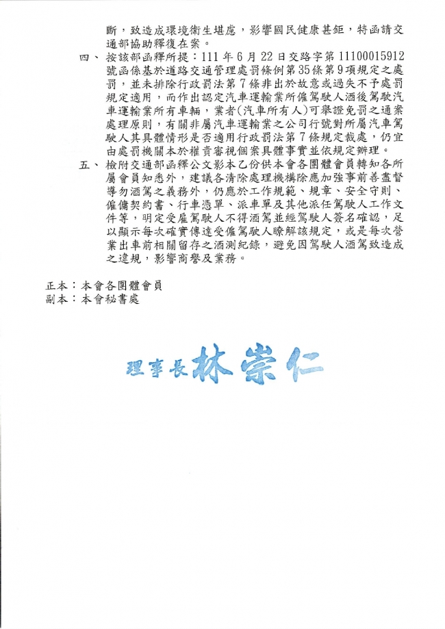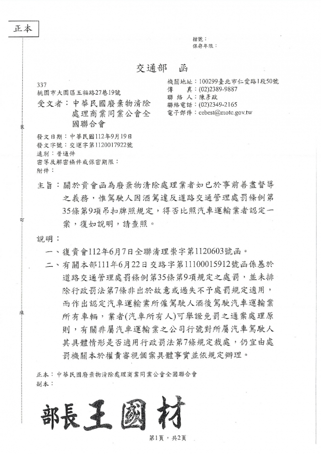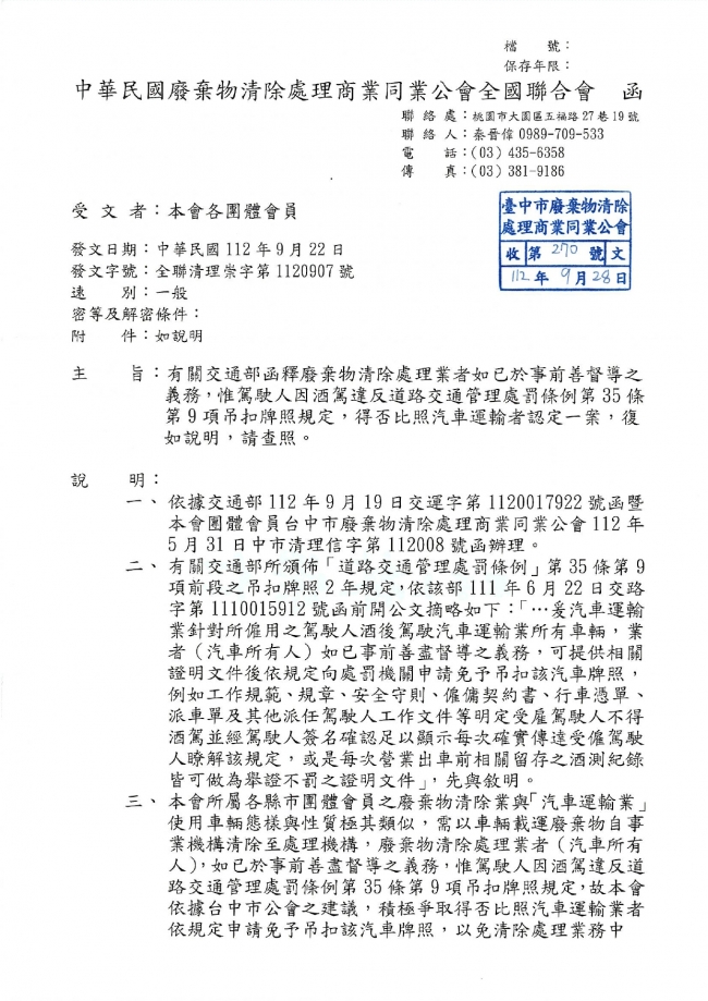 函轉 中華民國廢棄物清除處理商業同業公會全國聯合會 主旨:有關交通部函釋廢棄物清除處理業者如已於事前善督導之義務,惟駕駛人因酒駕違反道路交通管理處罰條例第35條第9項吊扣牌照規定,得否比照汽車運輸者認定一案,復如說明,請查照。