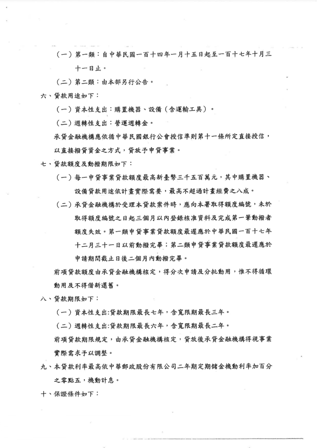 函轉大臺中商業總會 主旨:公告「中小微企業多元發展專案貸款要點」第二類受理申請期間,自即日起生效至116年10月31日止。