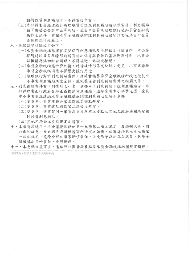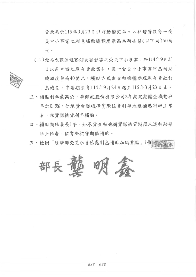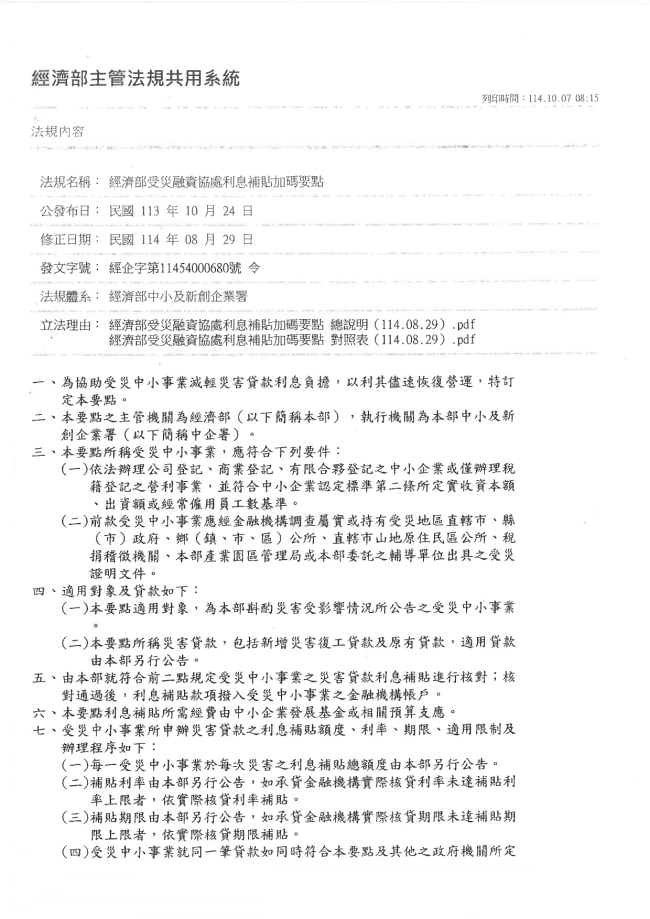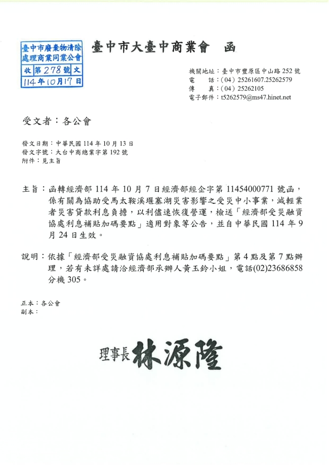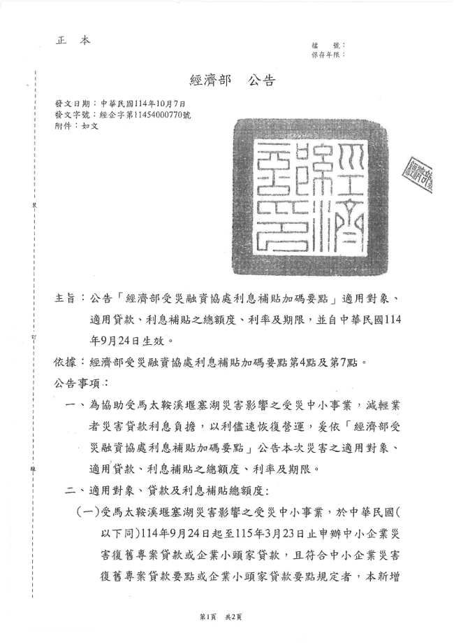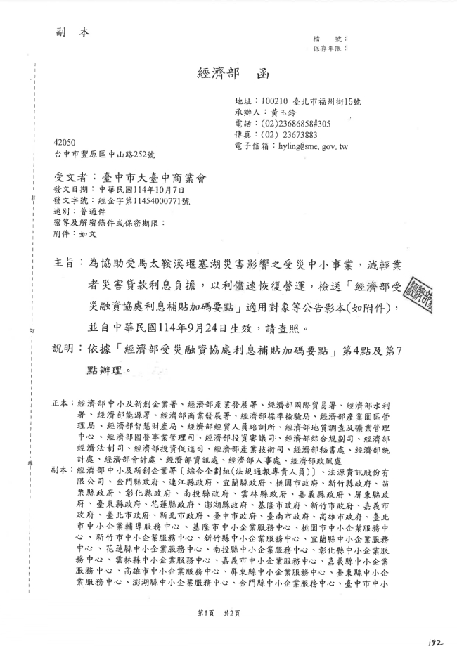 函轉臺中市大臺中商業會 主旨:函轉經濟部114年10月7日經濟部經企字第11454000771號函,係有關為協助受馬太鞍溪堰塞湖災害影響之受災中小事業,減輕業者災害貸款利息負擔,以利儘速恢復營運,檢送「經濟部受災融資協處利息補貼加碼要點」適用對象等公告,並自中華民國114年9月24日生效。