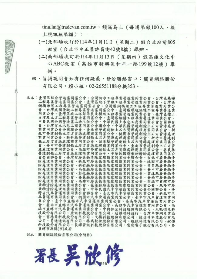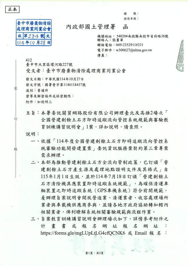 - 115.01.10 本會參加基隆市廢棄物清除處理商業同業公會召開:第10屆第2次會員大會。參加人員:丁民杰理事長、陳家琪秘書長
