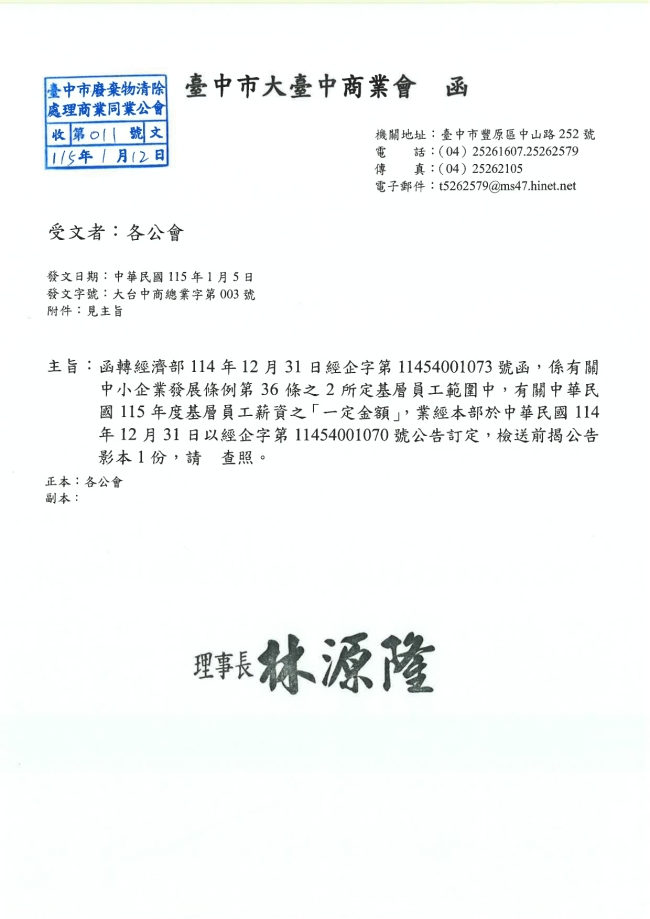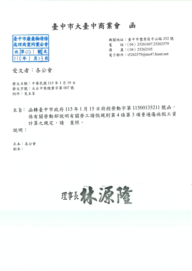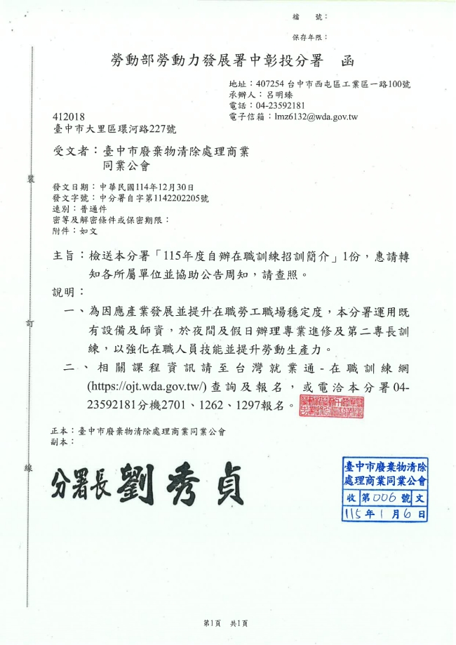 - 115.01.16 本會參加臺中市政府環境保護局工會召開:第四屆第三次會員代表大會。參加人員:丁民杰理事長、賴宗喜理事、劉連卿理事