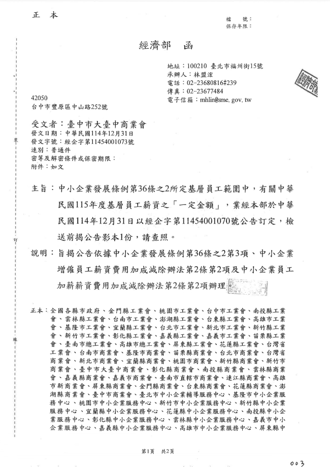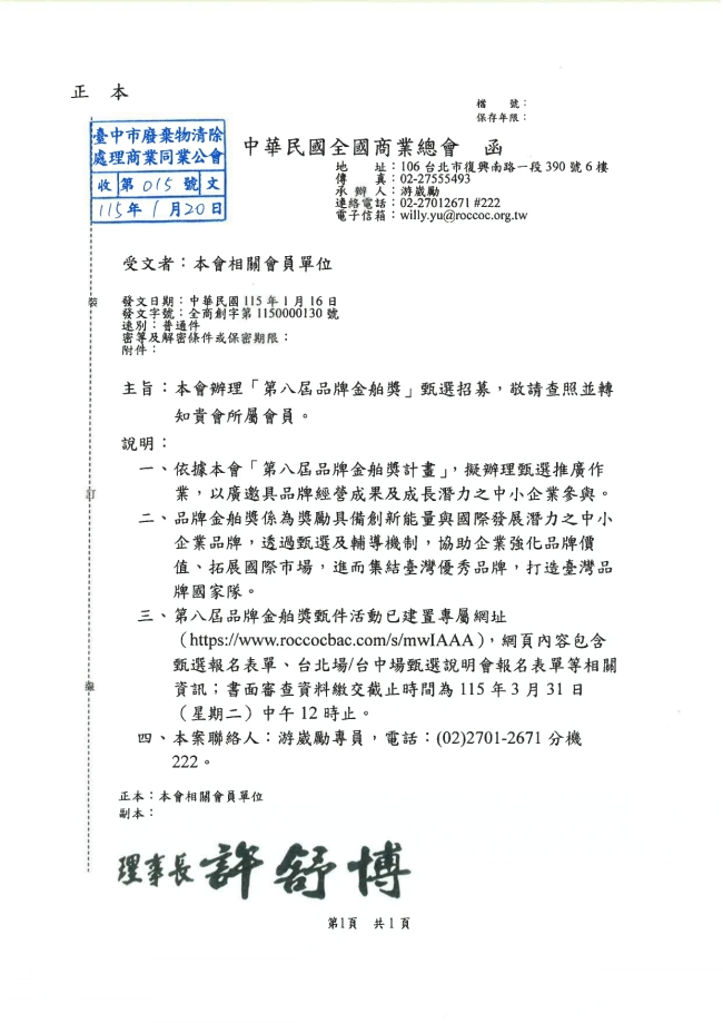 - 115.01.16 本會參加臺中市商業會舉行:臺中市商業界慶祝第七十九屆商人節表揚大會。參加人員:丁民杰理事長、黃其斌榮譽理事長、李吉朗副理事長、劉連卿理事、陳柏諺理事、施培軒理事、陳家琪秘書長、許芷郁副秘書長