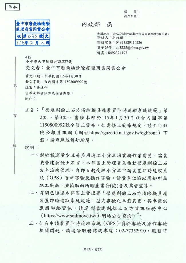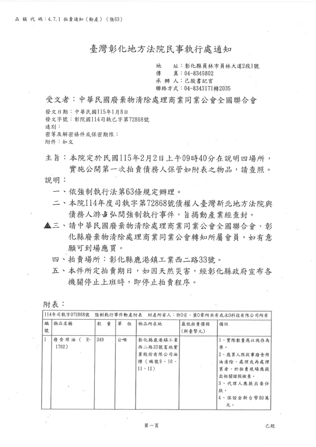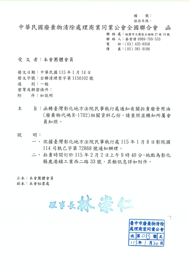 - 115.01.10 本會參加基隆市廢棄物清除處理商業同業公會召開:第10屆第2次會員大會。參加人員:丁民杰理事長、陳家琪秘書長