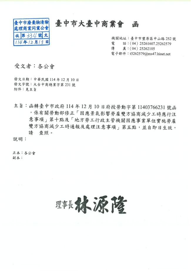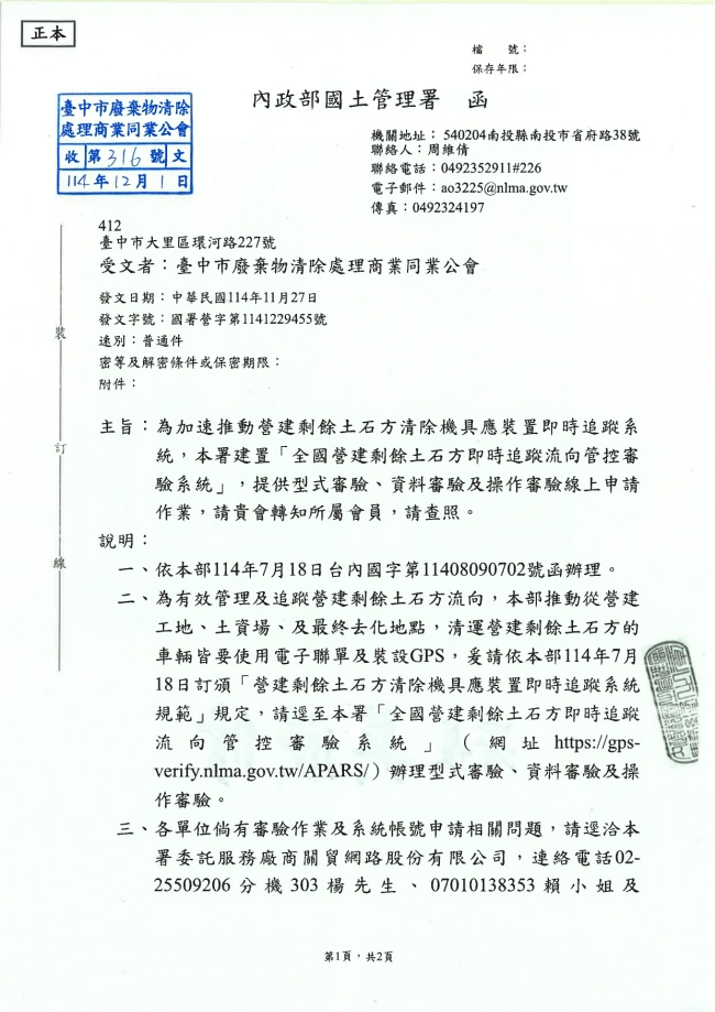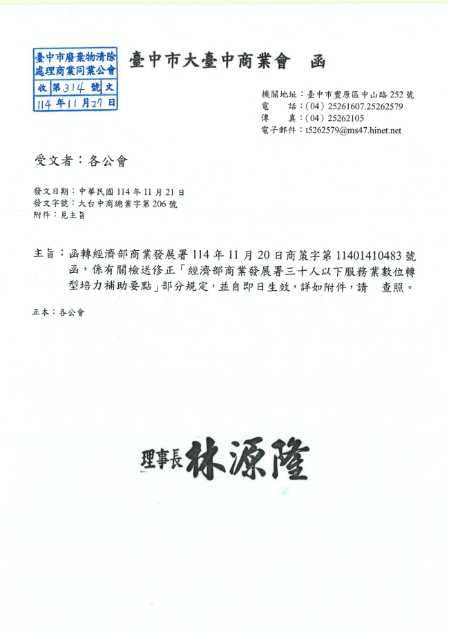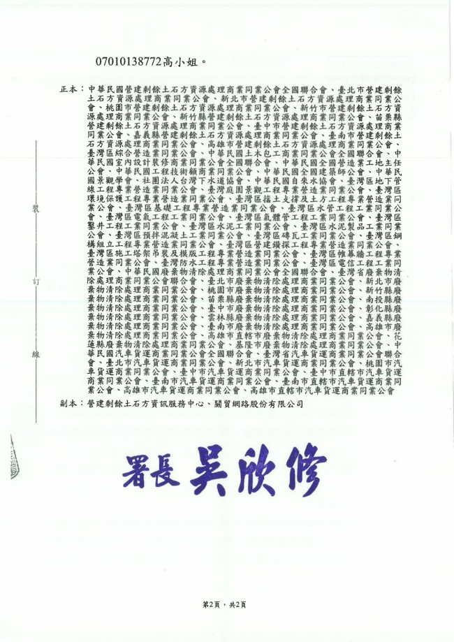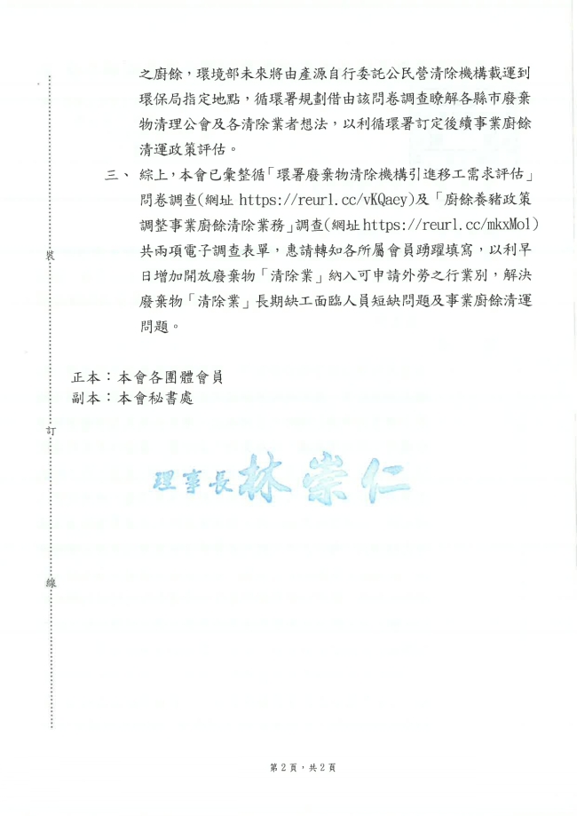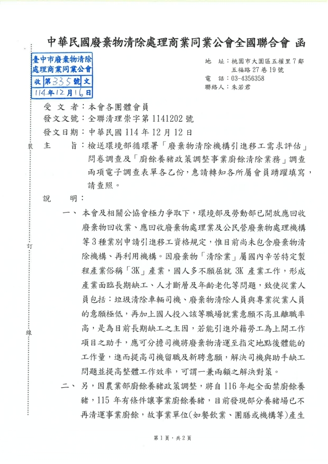 - 115.01.10 本會參加基隆市廢棄物清除處理商業同業公會召開:第10屆第2次會員大會。參加人員:丁民杰理事長、陳家琪秘書長