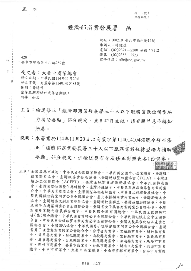 - 115.01.16 本會參加臺中市商業會舉行:臺中市商業界慶祝第七十九屆商人節表揚大會。參加人員:丁民杰理事長、黃其斌榮譽理事長、李吉朗副理事長、劉連卿理事、陳柏諺理事、施培軒理事、陳家琪秘書長、許芷郁副秘書長
