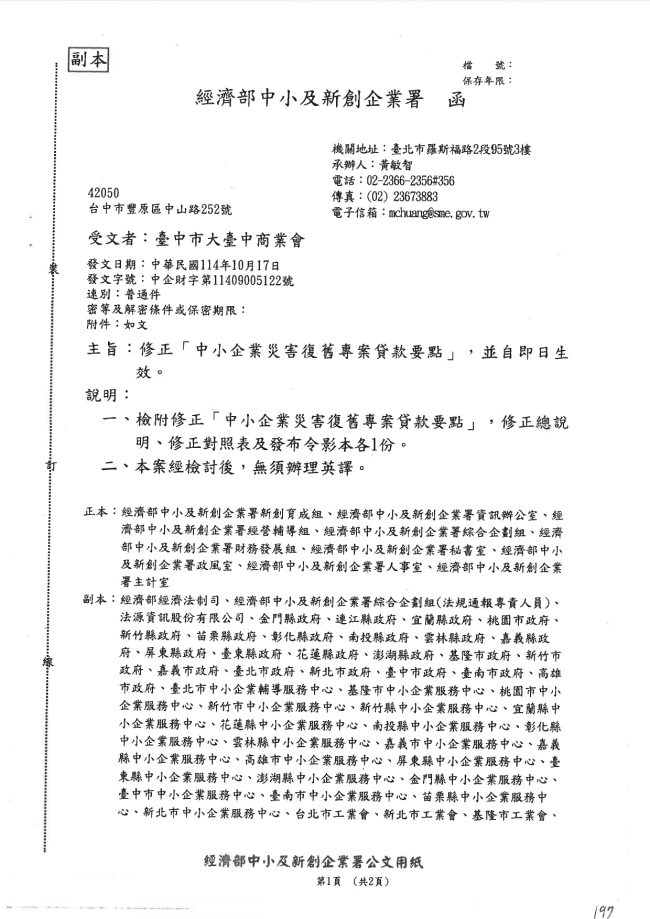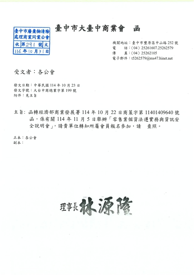 - 115.01.16 本會參加臺中市商業會舉行:臺中市商業界慶祝第七十九屆商人節表揚大會。參加人員:丁民杰理事長、黃其斌榮譽理事長、李吉朗副理事長、劉連卿理事、陳柏諺理事、施培軒理事、陳家琪秘書長、許芷郁副秘書長