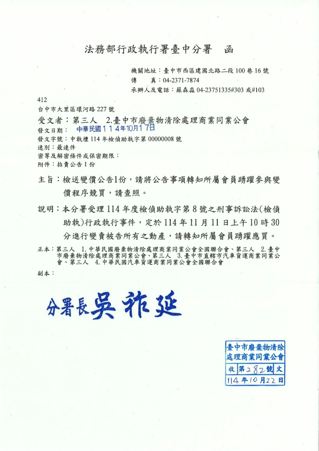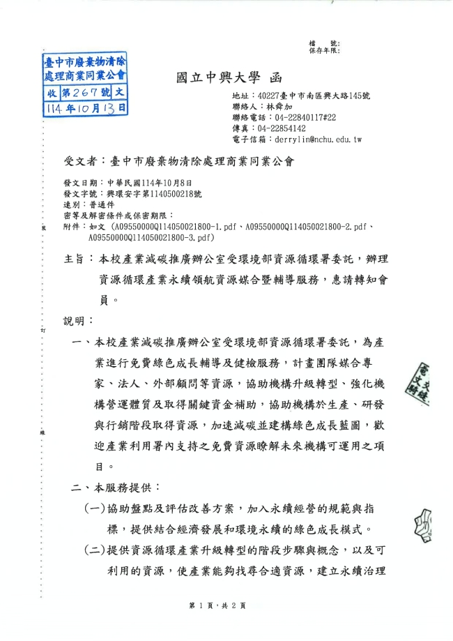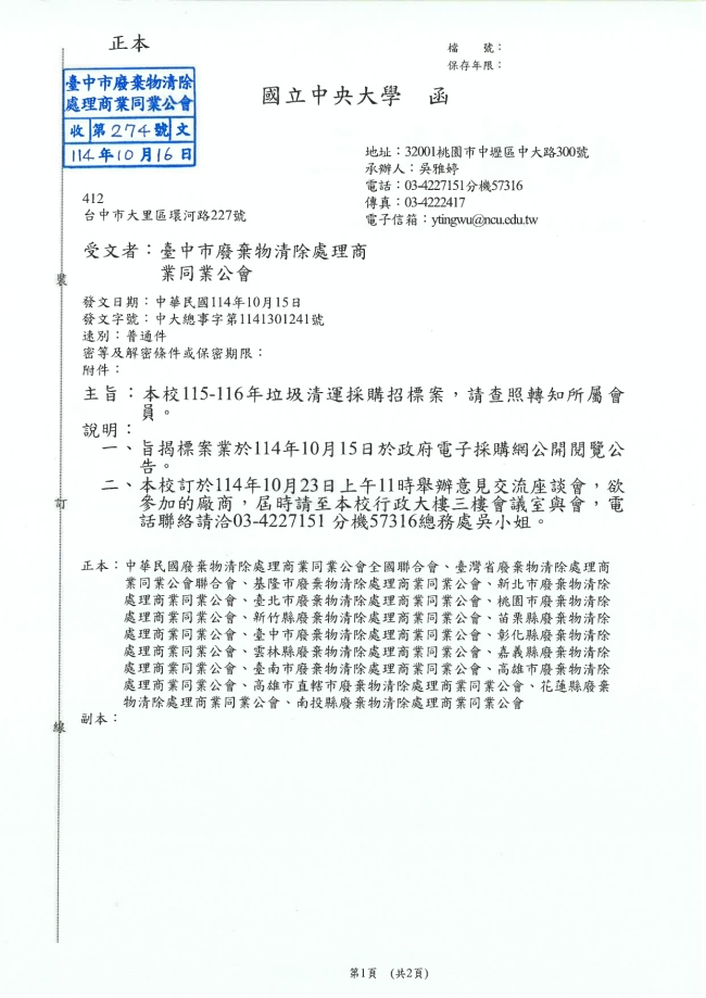 - 115.01.10 本會參加基隆市廢棄物清除處理商業同業公會召開:第10屆第2次會員大會。參加人員:丁民杰理事長、陳家琪秘書長