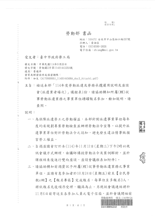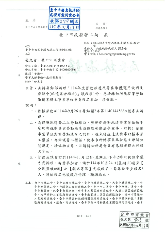 - 115.01.16 本會參加臺中市政府環境保護局工會召開:第四屆第三次會員代表大會。參加人員:丁民杰理事長、賴宗喜理事、劉連卿理事